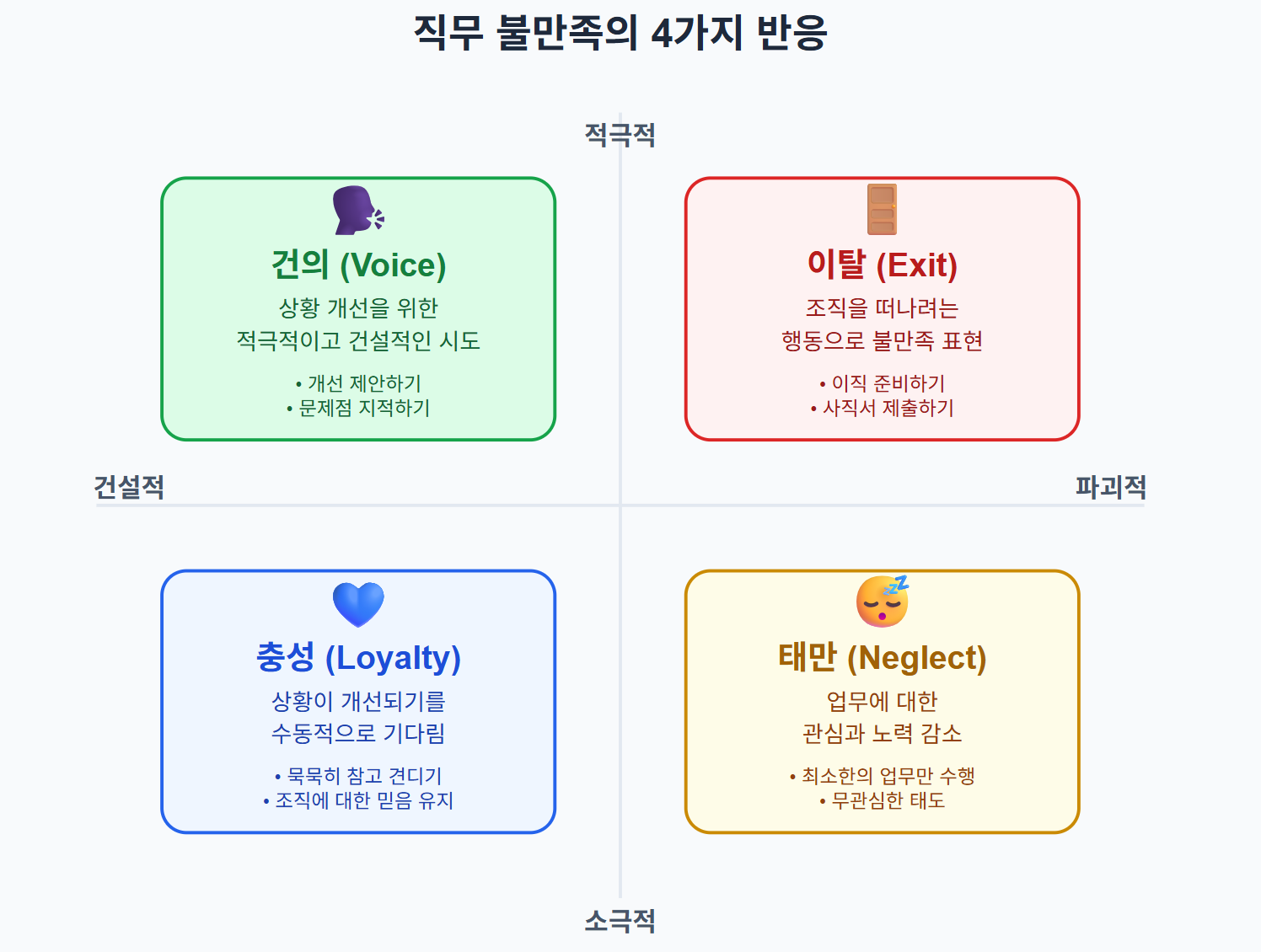 직무 불만족의 4가지 반응 🎯 리더를 위한 시사점