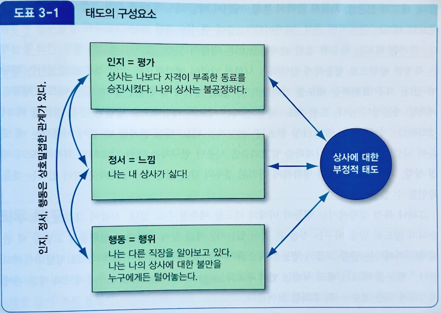 사실 이번 3장은 다른 장에 비해 특별히 새롭거나 인상적인 내용은 없었습니다. 태도가 인지적, 감정적, 행동적 구성요소로 나뉜다는 것이나, 직무만족이 중요하다는 것 등은 너무 당연한 이야기로 느껴졌거든요.