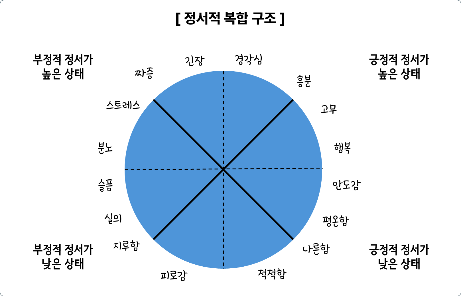 아래 그림은 긍정적인 정서(Positive Affect, PA)와 부정적인 정서(Negative Affect, NA)를 정도에 따라 분류하고 배열한 [정서적 복합구조]입니다. 인간의 감정이 단순히 좋다/나쁘다로 구분되지 않고, 에너지 수준(높고/낮음)과 감정의 방향성(긍정/부정)이 조합되어 나타난다는 것을 보여줍니다.