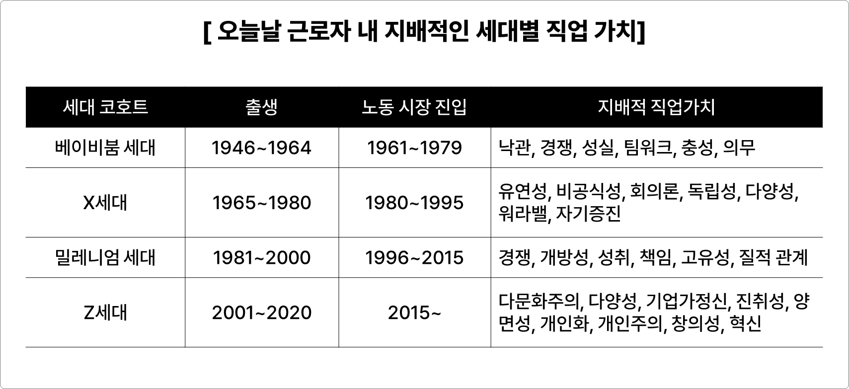 책에서는 세대 코호트별 지배적인 직업 가치에 대해서 정의를 하고 있습니다. 한국 현대사의 정치적 혼란, 높은 대학진학율, 군대라는 특수성을 고려하면 노동 시장 진입 시기는 5~6년은 더 뒤로 정의해야 될 것으로 생각됩니다만, 지배적 직업가치는 다시금 눈여겨 봐야 될 것으로 생각됩니다. 단, 이러한 세대별 범주를 부정의 고정관념으로 자리잡지 않게 해야 될 것입니다.
