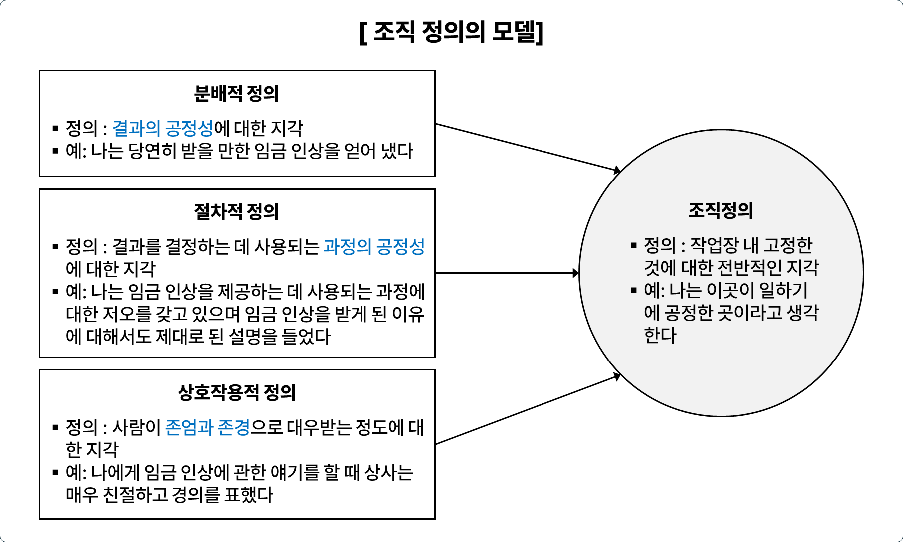 (Organizational Justice)분배적, 절차적, 정보적, 상호작용적 정의로 구성된 직장 내 공정성에 대한 전반적인 지각4가지 구성요소:• 분배적 정의: 결과의 공정성• 절차적 정의: 과정의 공정성• 정보적 정의: 정보 제공의 공정성• 상호작용적 정의: 대인관계의 공정성📰 하이닉스 보너스 사건 사례:💯 일관성이 매우 중요 - 공정성에서 일관성이 없으면 구성원은 롤러코스터를 타는 기분