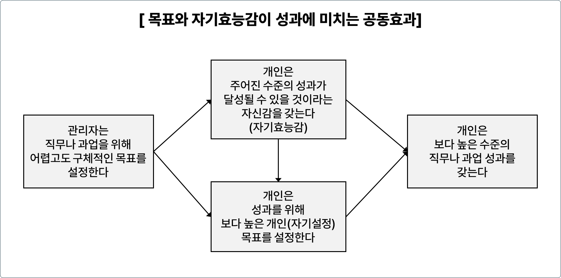 (Goal-Setting Theory)목표를 향해 일하려는 의도가 업무 동기부여의 주요 원천으로 간주되어 성과를 높인다는 이론목표의 4가지 역할:• 주의를 집중하게 한다• 노력을 투자하게 한다• 지속적으로 업무를 하게 한다• 목표 달성을 위한 전략을 수립하게 한다✨ 스스로 목표를 설정할 때 더 열정적⚠️ 상사가 할당할 때 우려와 불확실성 증가💪자기 효능감 이론