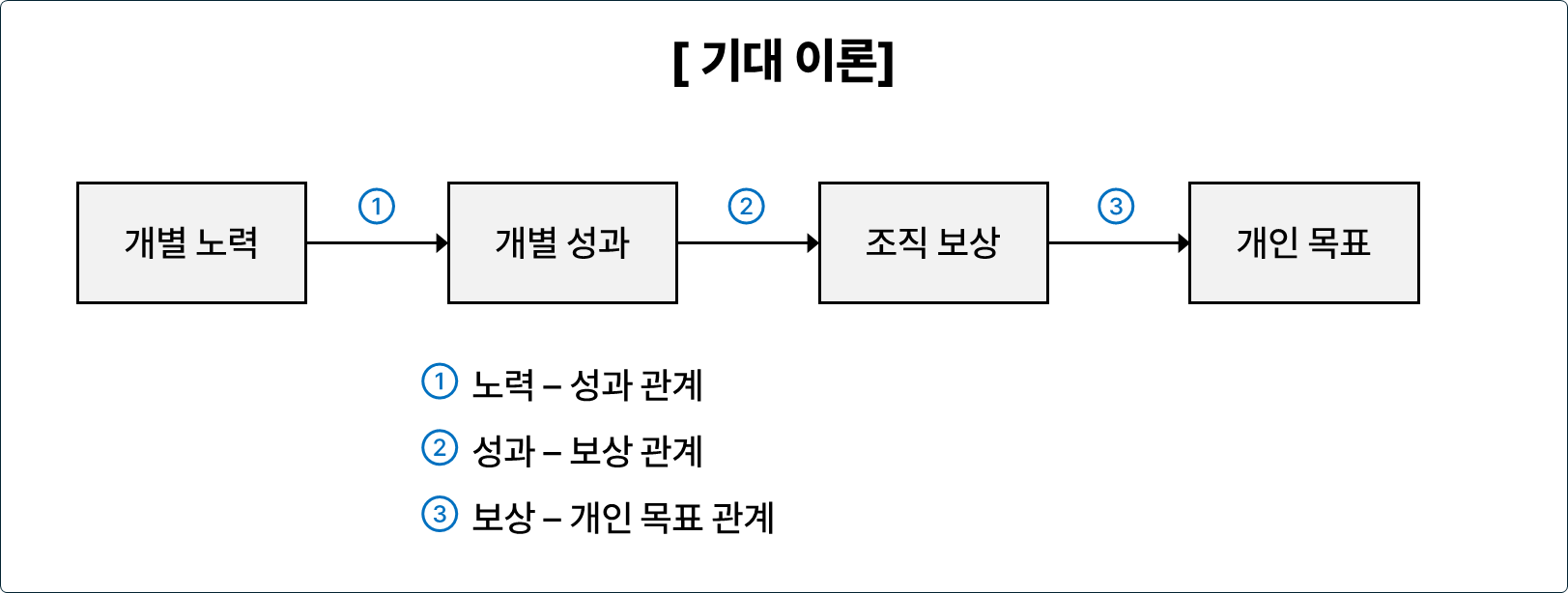 (Expectancy Theory)특정 방식으로 행동하려는 경향의 정도는 행동이 주어진 결과를 수반할 것이라는 기대의 강도와 개인에 관한 결과의 매력에 달려 있다는 이론3가지 핵심 요소:• 기대: 노력-성과 관계• 수단성: 성과-보상 관계• 유의성: 보상-개인 목표 관계📊 많은 구성원이 최소한의 일만 하는 이유를 설명🎯목표 설정 이론